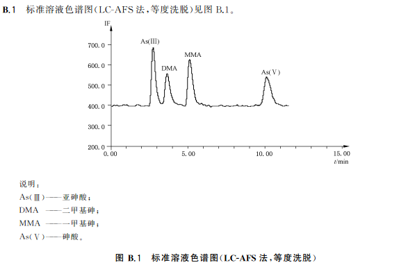 吸取試樣溶液100L注入液相色譜-原子熒光光譜聯用儀中,得到色譜圖,以保留時間定性。根據標準曲線得到試樣溶液中As(Ⅲ)與As(V)含量,As(Ⅲ)與As(V)含量的加和為總無機砷含量,平行測定次數不少于兩次。