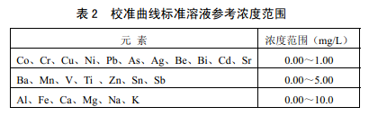 基于顆粒物樣品實際化學組成,表2 給出了標準溶液濃度參考范圍。建議在此范圍內除 標準系列空白溶液(5.9),依次加入多元素標準儲備液(5.13 )配制3 ~5個濃度水平的標準系列。各濃度點用硝酸溶液(5.9)定容至50.0 ml??筛鶕嶋H樣品中待測元素濃度情況調 整校準曲線濃度范圍。
