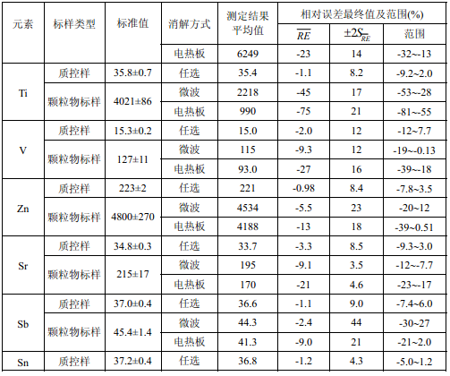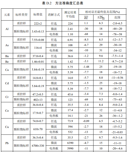 7家實驗室分別對統一提供的大氣顆粒物標樣、濾膜質控樣品、飛灰樣品(廢氣顆粒物模擬樣品)和2 個顆粒物負載量不同的TSP 樣品,同時取6 份平行樣品分別進行微波消解 (7.2.1.1 )和電熱板消解(7.2.1.2 ),用等離子體發射光譜法測量。對測定結果進行數理統 計,得到方法的精密度(各元素測定值的實驗室內標準偏差范圍、實驗室間標準偏差、重復 性限和再現性限)和方法的準確度(各元素測定值的相對誤差范圍和相對誤差最終值),詳 見附錄D。
