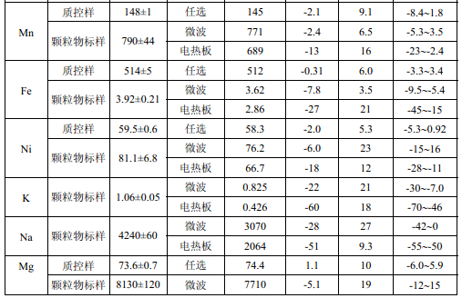 濾膜質控樣品由美國職業健康研究所提供(A-3.1)。顆粒物標樣為美國 NIST(1648a)。 樣品消解處理采用硝酸-鹽酸混合溶液(5.6),定容體積為 50.0 ml。不同類型樣品測定值濃 度(或含量)單位分別為:質控樣(μg )、顆粒物標樣(μg/g)、飛灰樣品(μg/g)和 TSP 樣品(μg/cm 2 )。其中顆粒物標樣中 Al 、Ca、K 元素含量單位為重量百分比(% )。